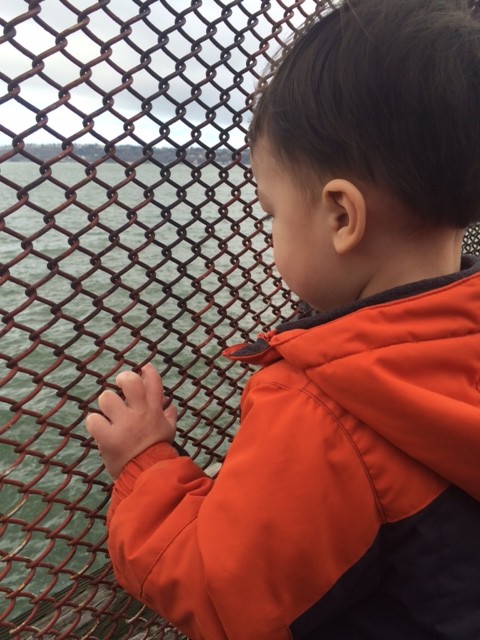 From there we crossed the street, and he attached himself to the fence to look out over the water, looking for fish. I kept telling him that we were going to go seefish, but he was very concerned about trying to find them in the (super nasty) water right off the pier. We watched a ferry come inand some seagulls fly above and eventually I convinced him that there was more to the adventure beside the trolly tracks and the water down below. It was sad to see the garbage floating just off the pier. It was a good chance to talk about how we throw trash in the garbage and not on the ground. #teachablemoment.
