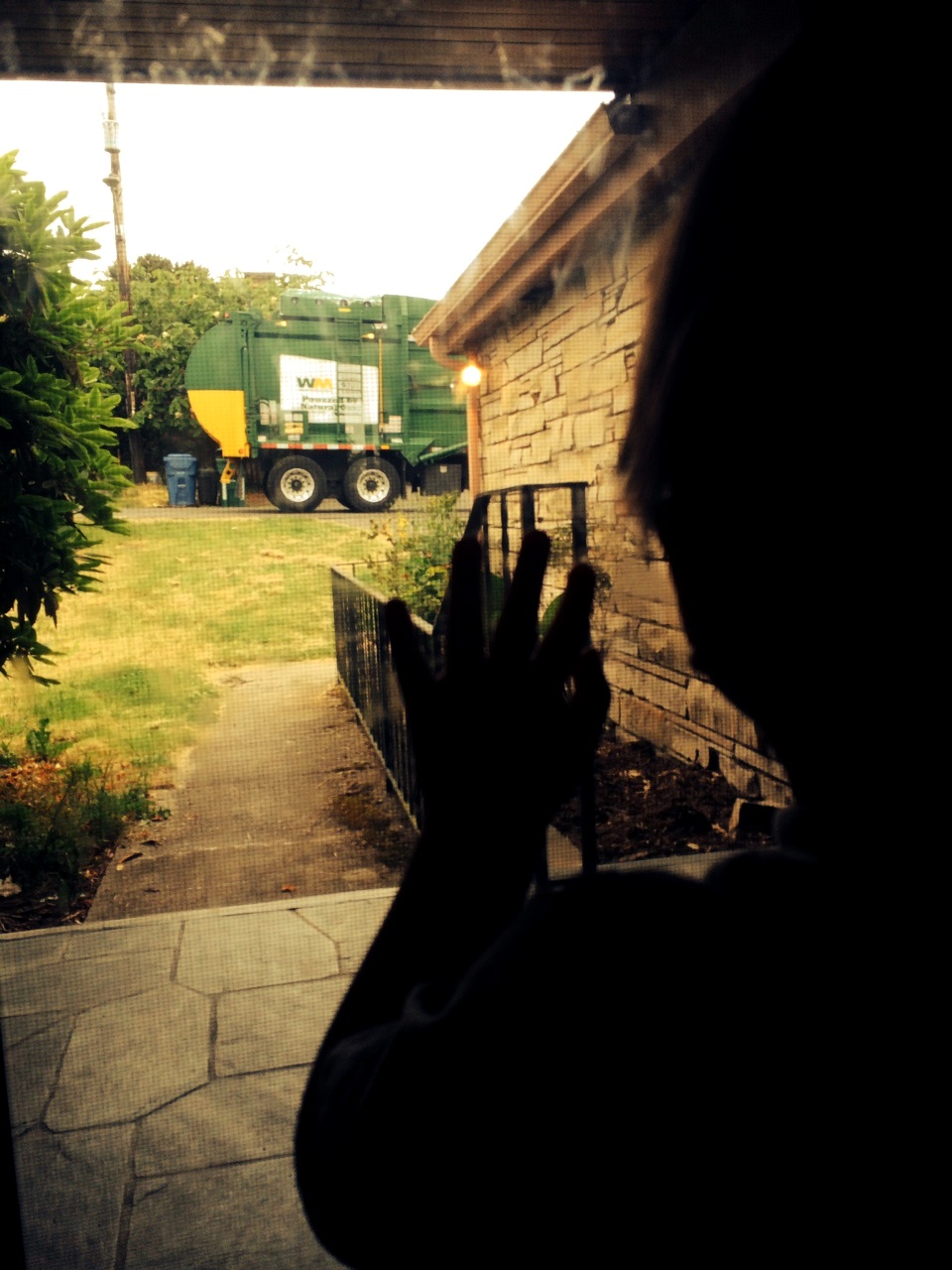 our shoes, but a day like today, we left our sweatshirts on (it wasn’t too cold, but a bit of a breeze from the front door). Evan was in the middle ofsnack when the first truck rumbled to a stop out front. He’s off the chair in a flash and face pressed to the screen door as he announces their arrival over and over. We get six viewings as they go down the street and come back up the other side awhile later. Once the first goes by, that’s the end of any game we might be playing.